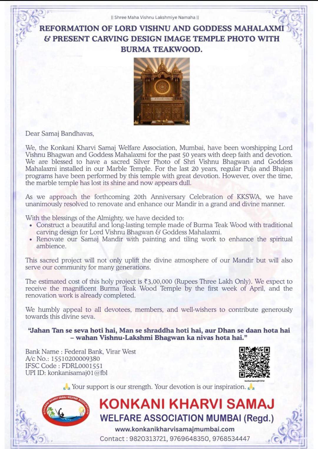 Greetings to all the members of the Konkani Kharvi Samaj. As you all know, our Annual Pooja has been scheduled on 12 April 2026. This year’s Annual Pooja is even more special because our revered Lord Mahavishnu and Goddess Lakshmi will be seated in a grand and beautiful new temple. It will truly be a joyful and delightful moment for all of us. I humbly request everyone to take advantage of this auspicious occasion and attend in large numbers to make the program successful. Along with this, a children’s stage program will also be organized after the Annual Pooja. Therefore, those children who wish to participate in the dance program are requested to submit their names by 8 April 2026. Thank you. KKSWA