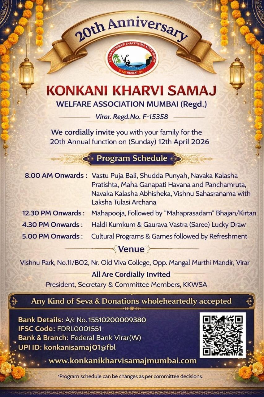 Greetings to all the members of the Konkani Kharvi Samaj. As you all know, our Annual Pooja has been scheduled on 12 April 2026. This year’s Annual Pooja is even more special because our revered Lord Mahavishnu and Goddess Lakshmi will be seated in a grand and beautiful new temple. It will truly be a joyful and delightful moment for all of us. I humbly request everyone to take advantage of this auspicious occasion and attend in large numbers to make the program successful. Along with this, a children’s stage program will also be organized after the Annual Pooja. Therefore, those children who wish to participate in the dance program are requested to submit their names by 8 April 2026. Thank you. KKSWA Mumbai